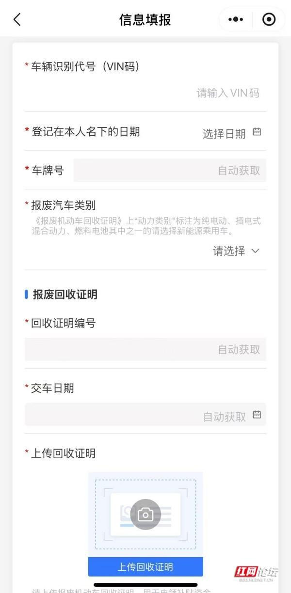 填写报废汽车信息,车辆识别代码(见旧车绿本或旧车注销证明或旧车回收证明)、登记在本人名下的日期(见旧车登记证书),上传报废机动车回收证明(需看回收证明的最右边第五联,用于申领补贴资金)。