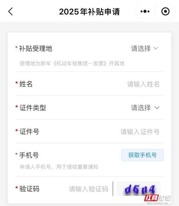 填写好补助受理地(这个受理地为新车发票的开具地)、姓名、身份证号码、手机号码。