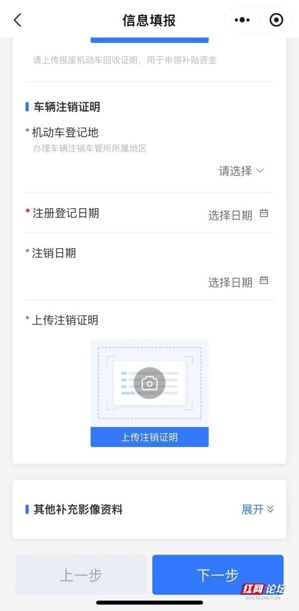 填写机动车登记地、注册登记日期、注销日期(均查询机动车注销证明书),上传注销证明。